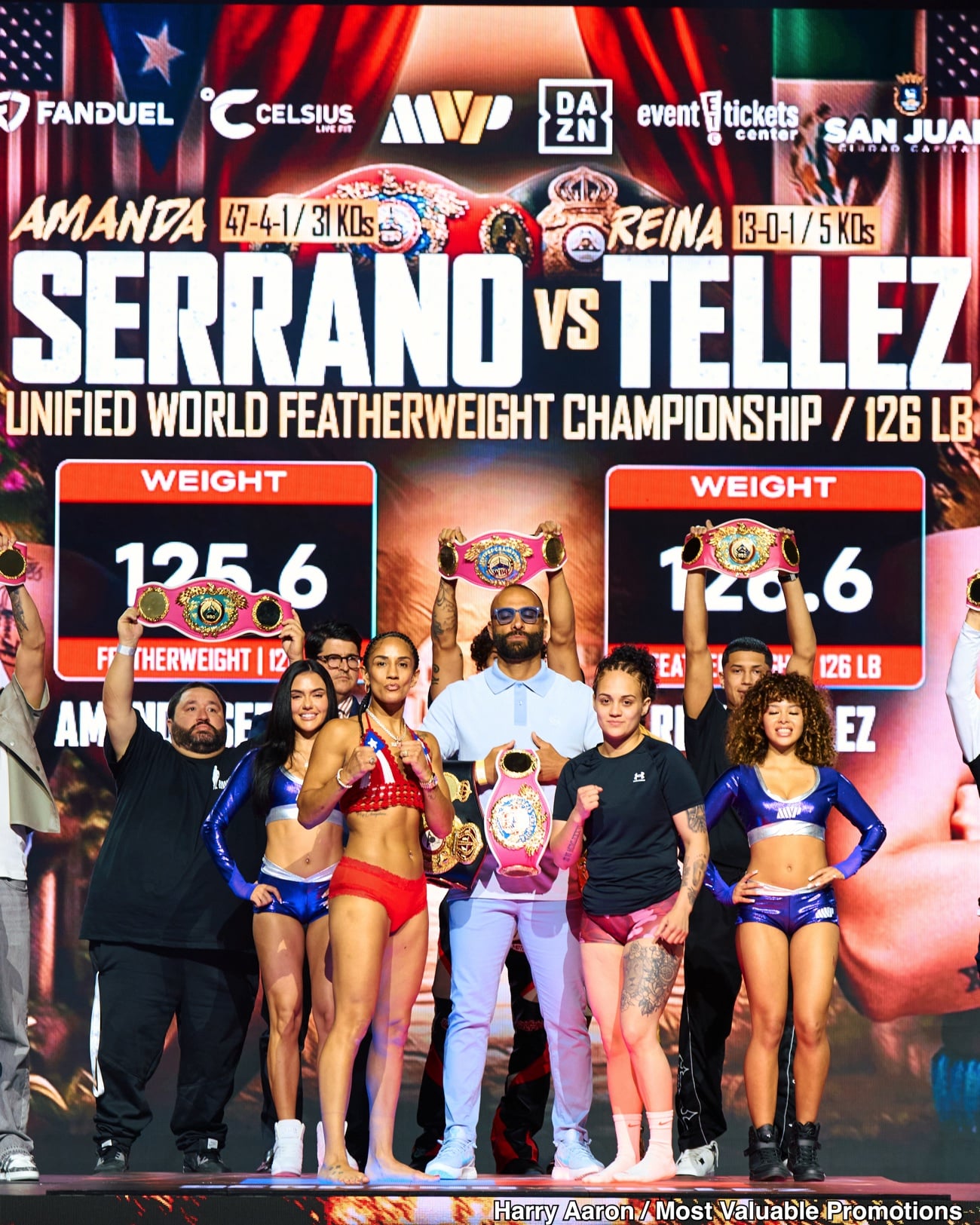Amanda Serrano defends her WBA and WBO featherweight titles against Reina Tellez tonight at the Coliseo Roberto Clemente in San Juan, Puerto Rico.